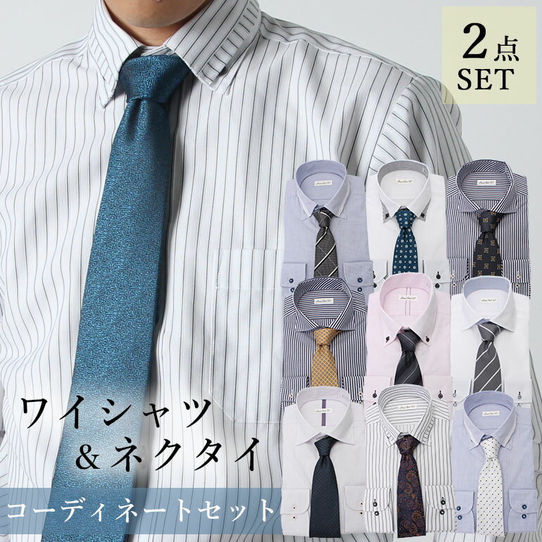 ワイシャツネクタイセット ワイシャツ 長袖 形態安定 メンズ 紳士 ストライプ 白 ワイドカラー マイターカラー ボタンダウン ドレスシャツ ネクタイ ジャガード織り 二枚襟 コーディネート カッターシャツ Yシャツ おしゃれ ビジネス 定番 無地
