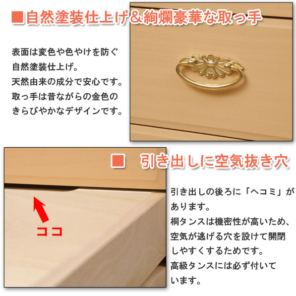 引出しの前板のデザインや桐たんすの色焼けや変色を防ぐ水性塗装等、長くお使いいただけるように仕上げた逸品です。